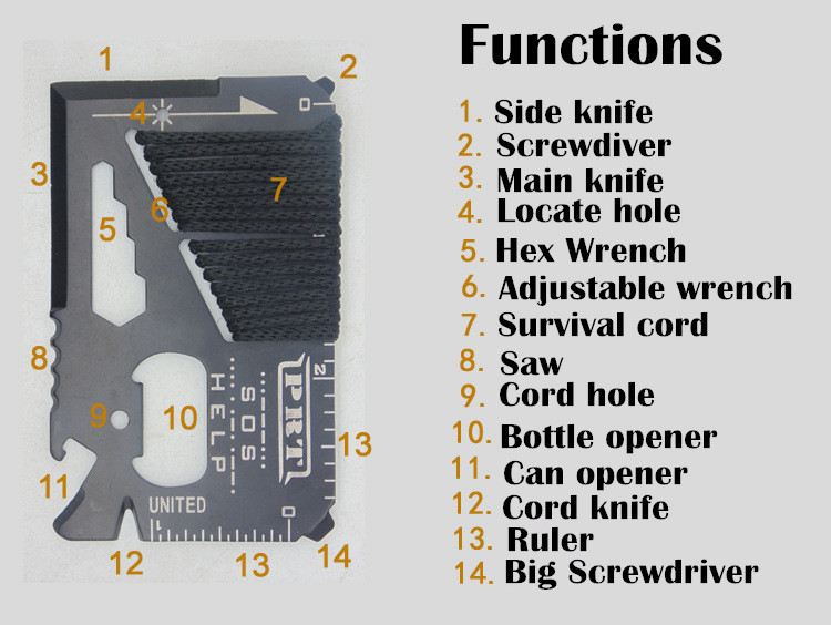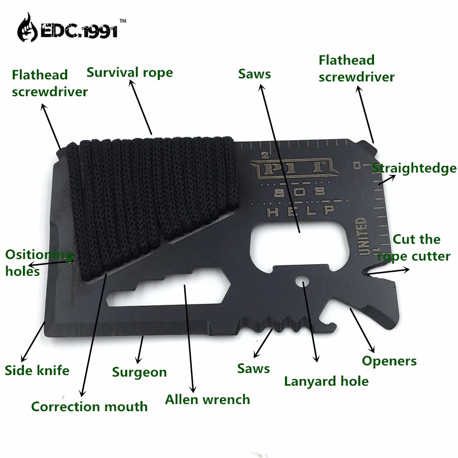 Multiherramienta plana tipo tarjeta EDC 911 de cartera con 11 funciones y paracord F-103