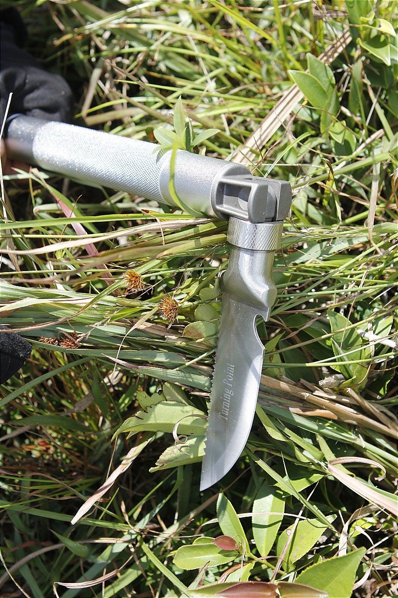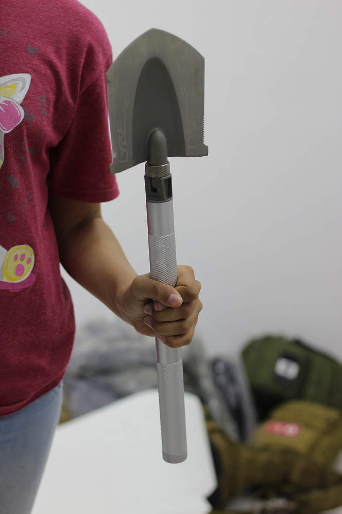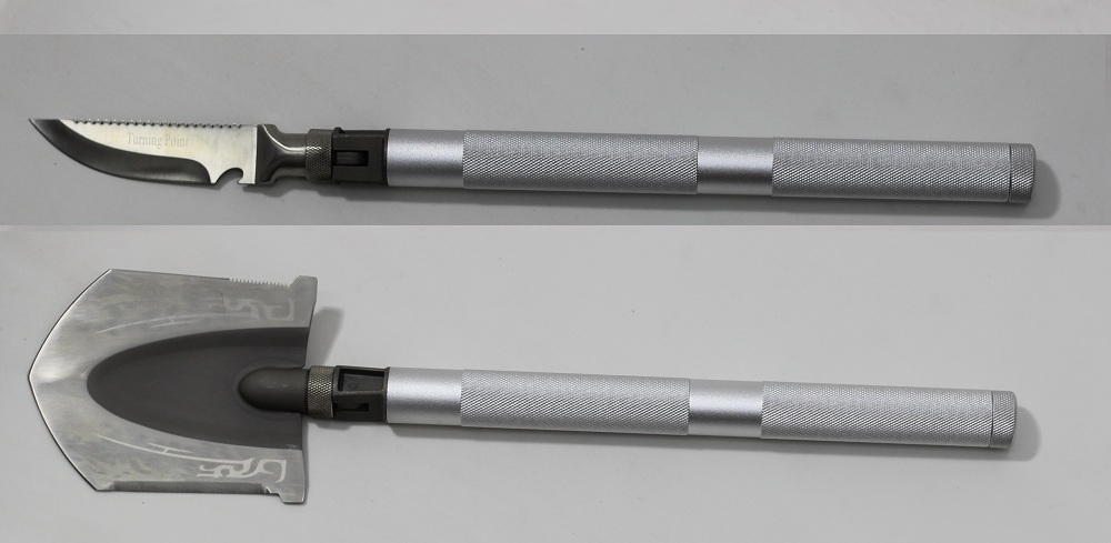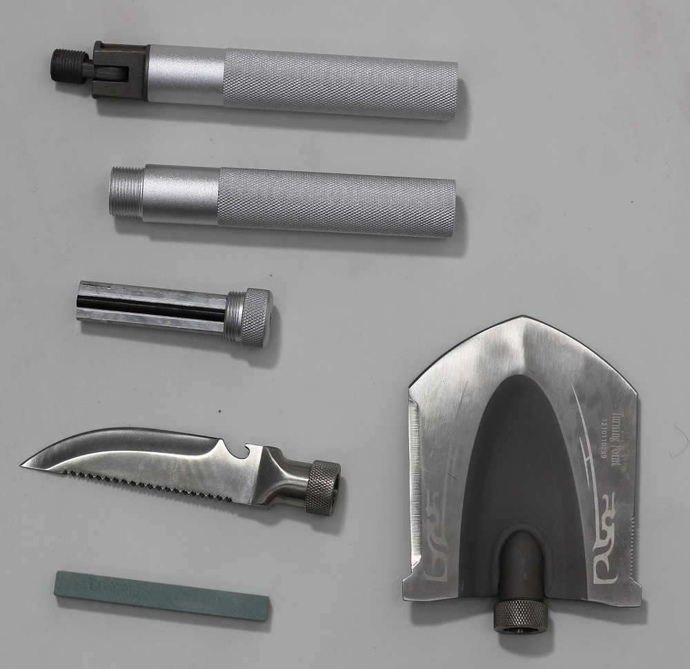Pala multiherramienta fabricada en acero inoxidable y aluminio.,