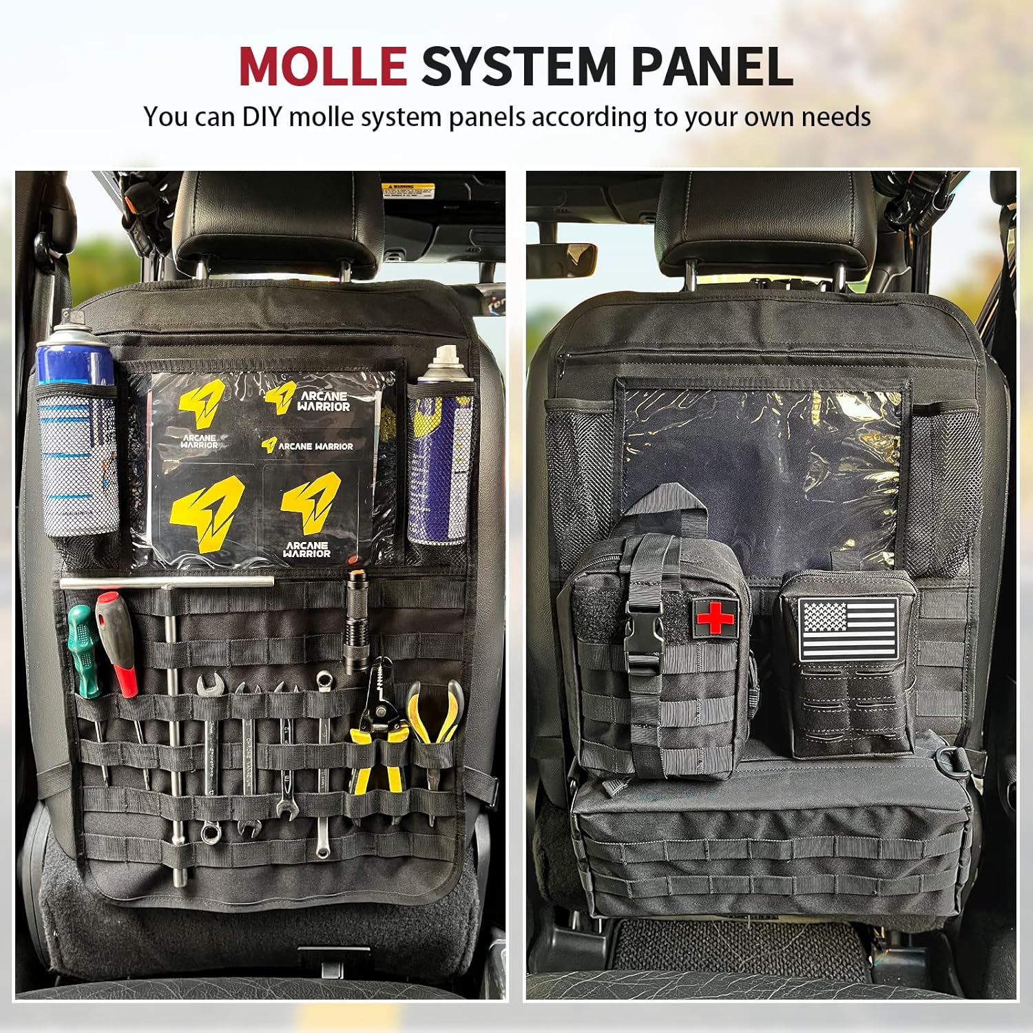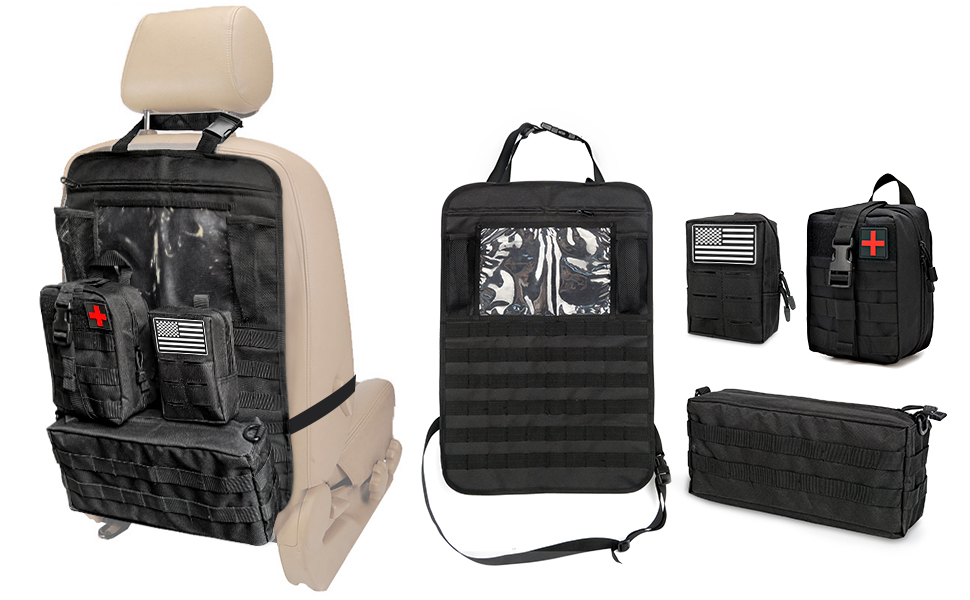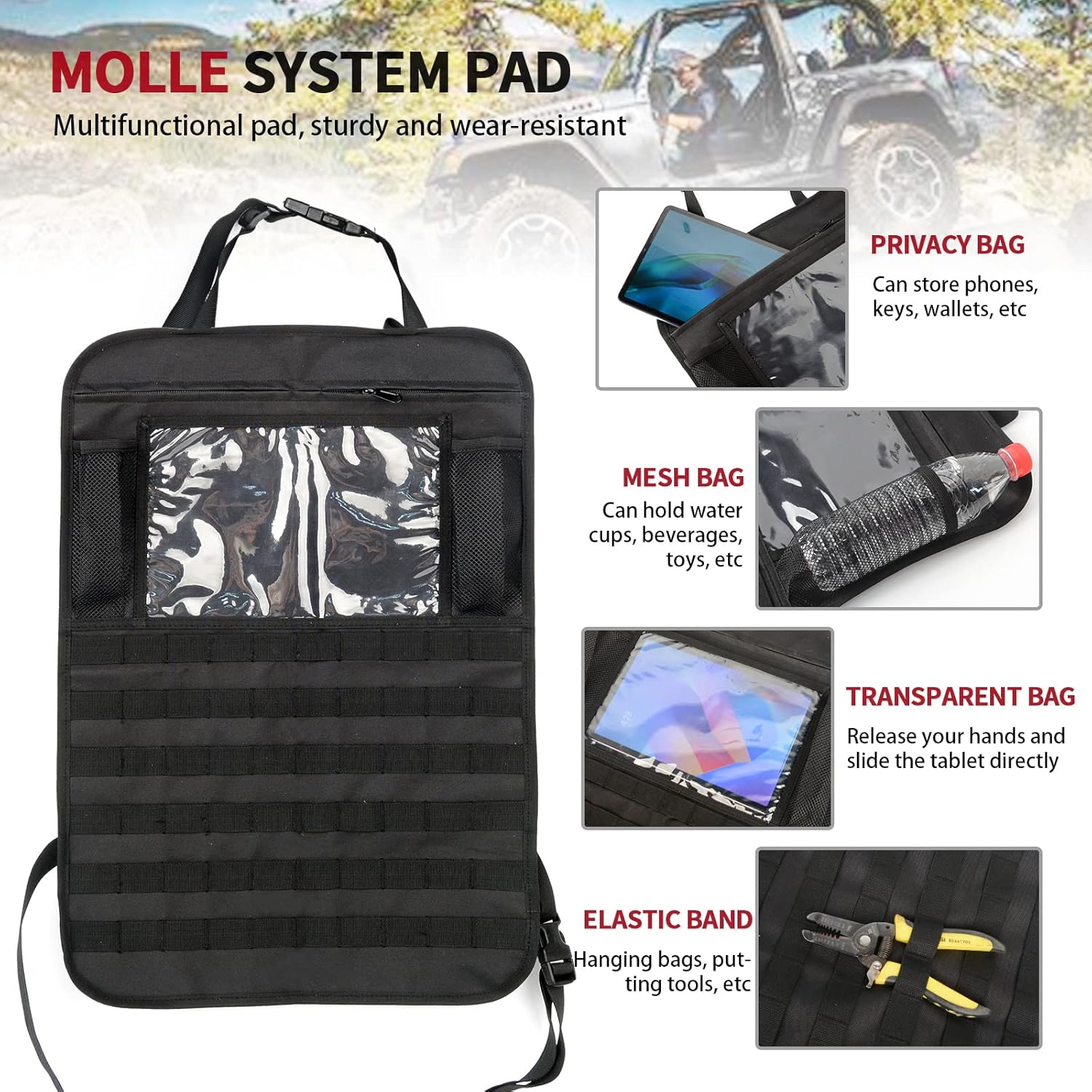 - El panel táctico de diseño más innovador: el panel trasero de asiento Molle táctico tiene cuatro bolsillos. La parte superior del panel Molle tiene bolsillos en capas, con la cierre. Además, vienen con dos bolsillos de agua de malla elástica y un bolsillo de PVC impermeable transparente de 10 x 6.5 pulgadas. El bolsillo de PVC puede contener un iPad de 9.7 pulgadas, los pasajeros del asiento trasero pueden disfrutar de películas durante el viaje. Hay los tablero, se puede utilizar para fijar tu herramienta o la bolsa que viene con la bolsa del paquete.