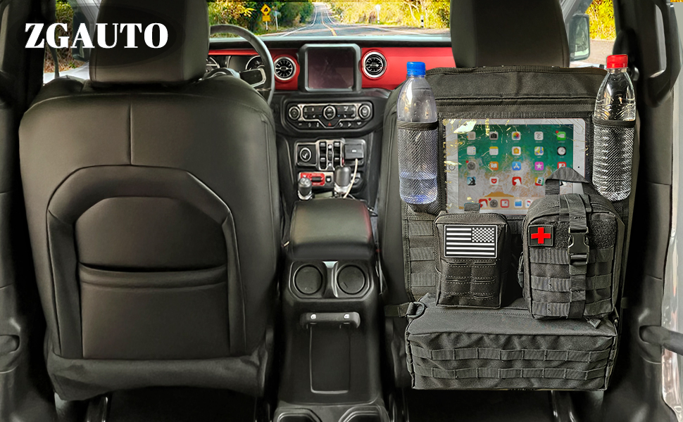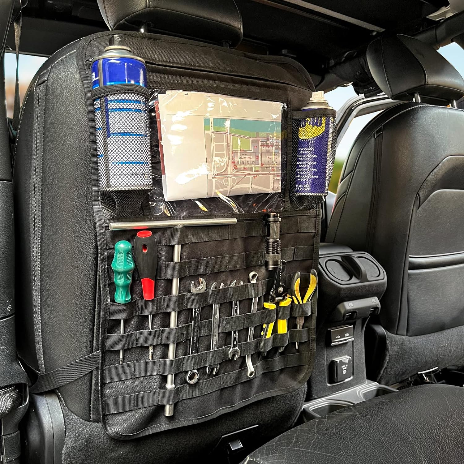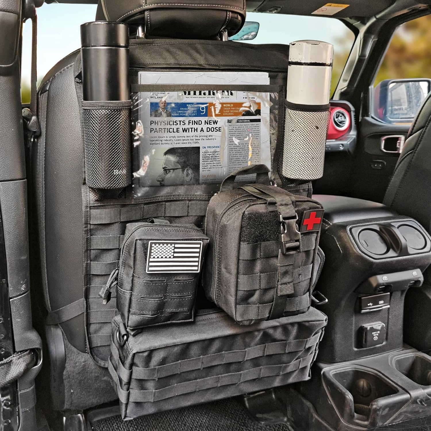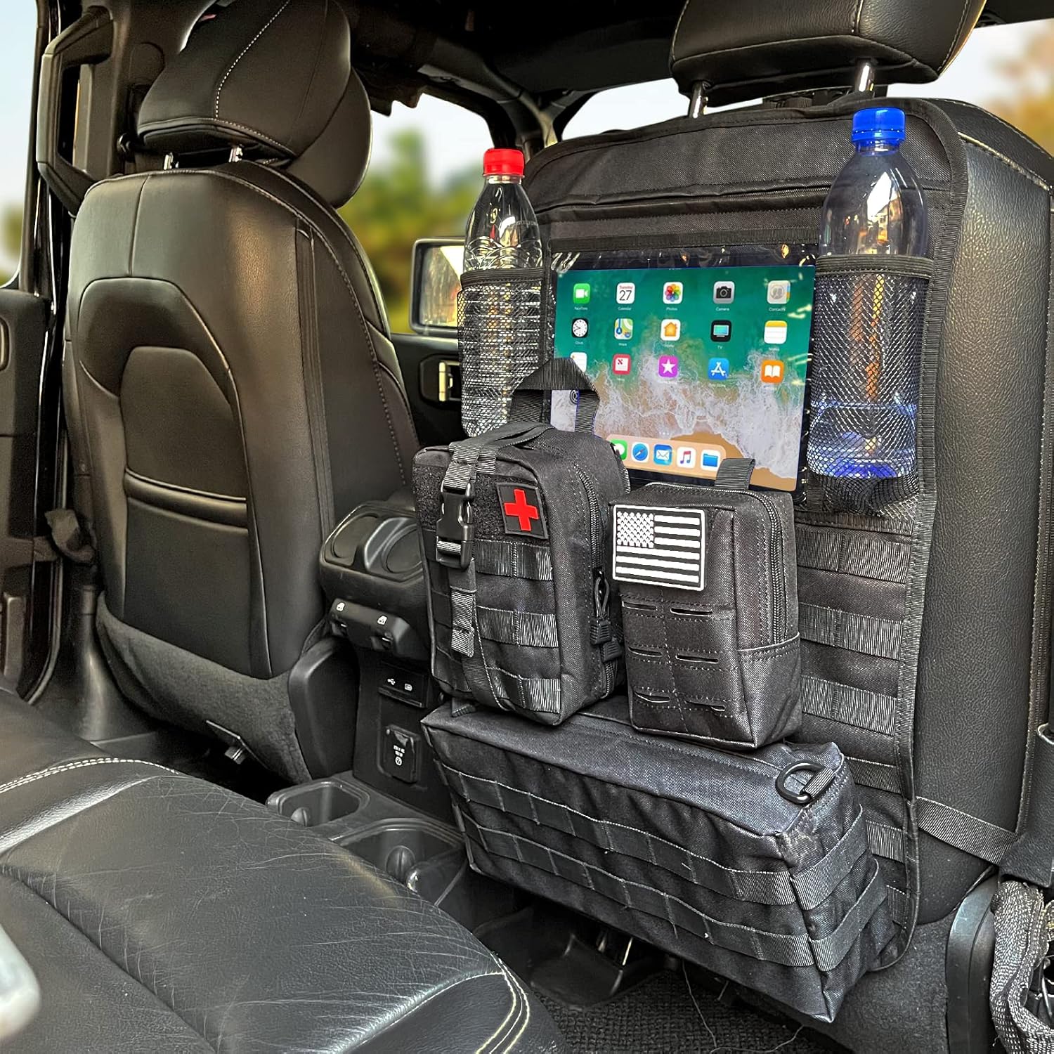 - El panel táctico de diseño más innovador: el panel trasero de asiento Molle táctico tiene cuatro bolsillos. La parte superior del panel Molle tiene bolsillos en capas, con la cierre. Además, vienen con dos bolsillos de agua de malla elástica y un bolsillo de PVC impermeable transparente de 10 x 6.5 pulgadas. El bolsillo de PVC puede contener un iPad de 9.7 pulgadas, los pasajeros del asiento trasero pueden disfrutar de películas durante el viaje. Hay los tablero, se puede utilizar para fijar tu herramienta o la bolsa que viene con la bolsa del paquete.