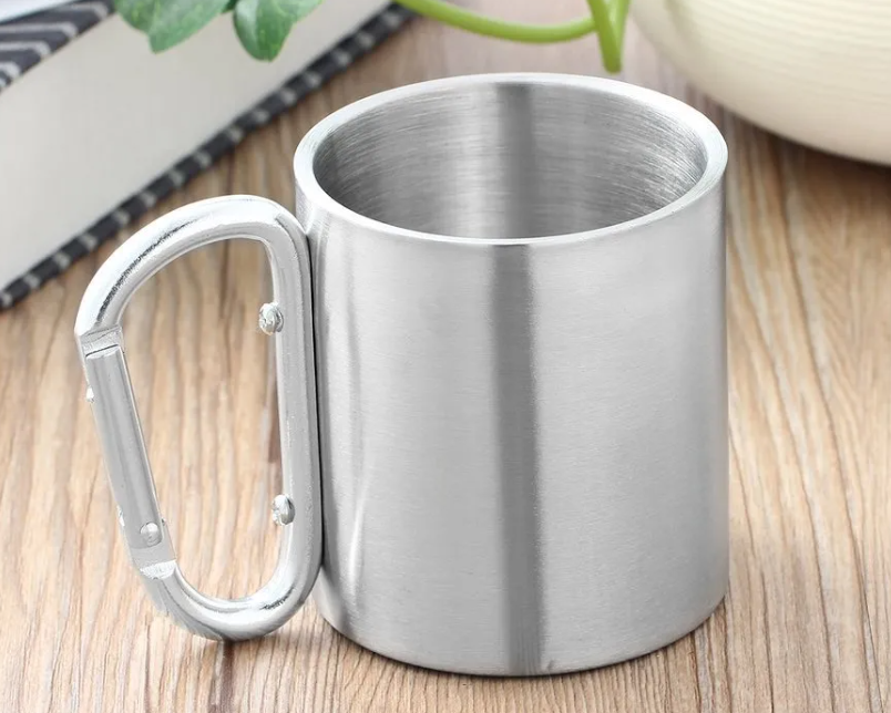 Esta taza con mosquetón consiste en un aislamiento de doble pared de acero inoxidable y viene con un mango de mosquetón de 8 cm.